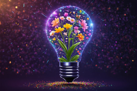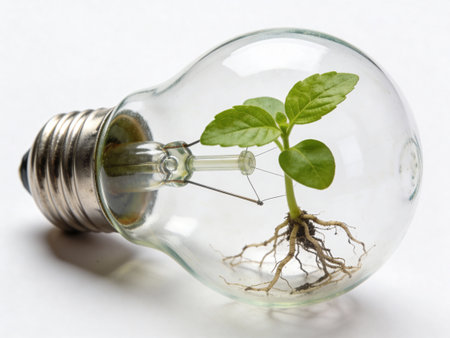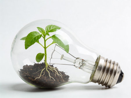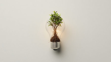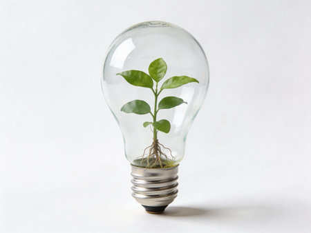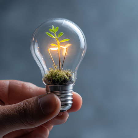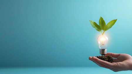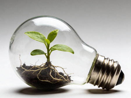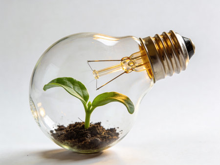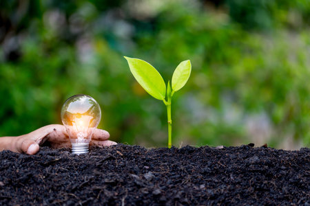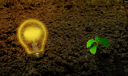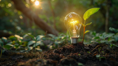 A bright idea takes root as an illuminated bulb rests near a tender sprout, embodying sustainable innovation and natural development beneath a clear sunlit sky.