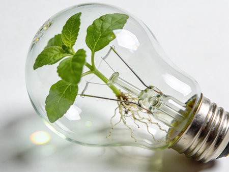 A glowing lightbulb with green leaves, symbolizing sustainable and eco-friendly energy solutions.