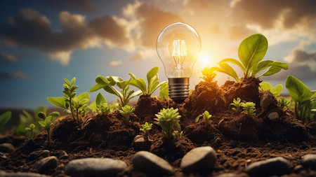 A clear lightbulb shines brightly amidst verdant plants thriving in rich soil, representing the merge between innovative ideas and sustainable energy solutions under a dramatic sky backdrop infused with sunlight.