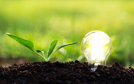 Young green plant growing on soil with small light bulb as environment and energy concept