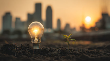 A luminous filament illuminates a fresh sprout emerging from rich soil, set against a cityscape bathed in golden sunset hues, representing eco-friendly innovation and fut