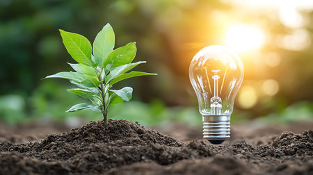 A transparent bulb beside a delicate sprout rising from rich earth, set against a gentle, natural backdrop highlighting eco-friendly growth and clean energy ideas.