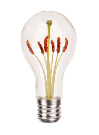Classic incandescent light bulb with pollen tube and stamen anthers isolated on white background. Energy concept flower bioluminescence idea photo