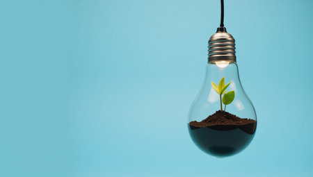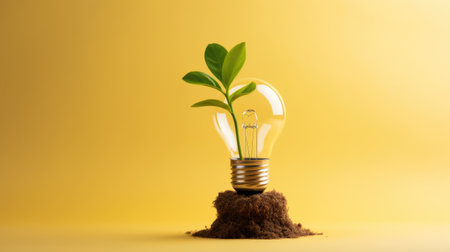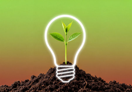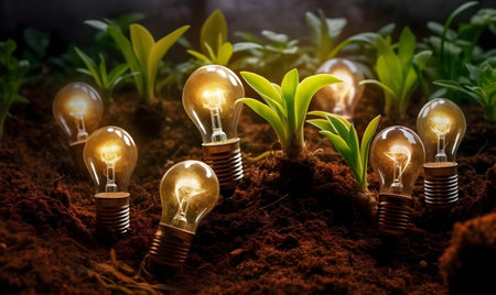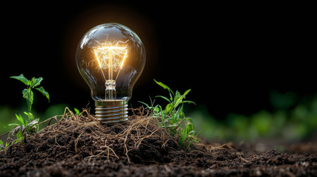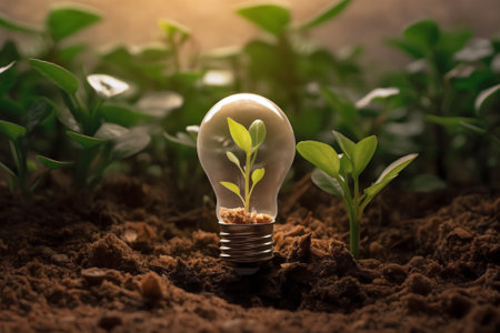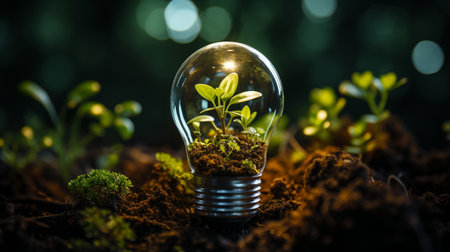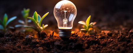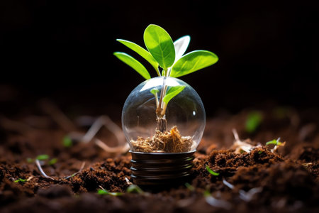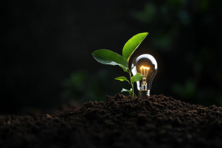 A vibrant young plant emerges from rich soil, illuminated subtly by a radiant bulb, representing eco-friendly growth and innovative green solutions in harmony with n