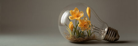A captivating image of a light bulb with vibrant flowers growing inside, representing the harmony between technology and nature in a serene green background. Perfect for eco-themed projects.