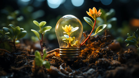 Light bulb with green plants inside and growing from the ground, energy saving and environmental resource conservation concepts, AI Generated illustration