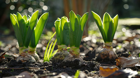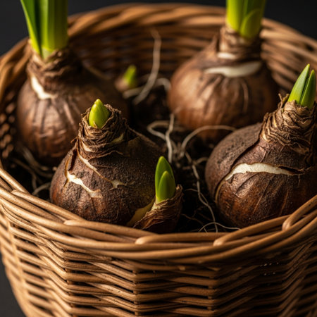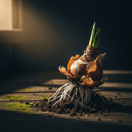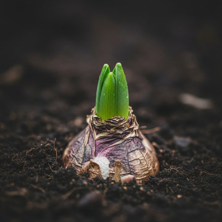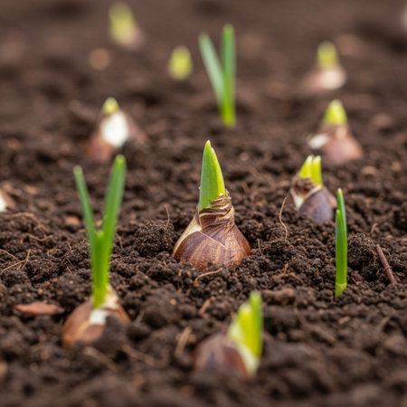Over-the-shoulder POV of daffodil bulbs actively sprouting in dark, nutrient-rich earth covered in t