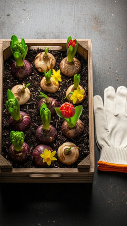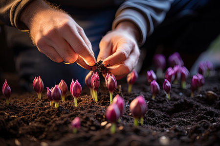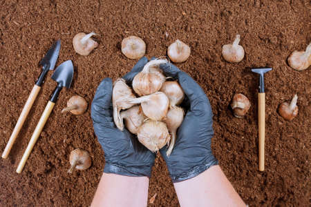 Planting crocus bulbs in the ground. Farmer in gloves planting saffron. Garden tools.