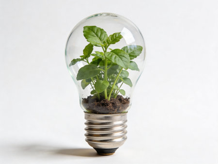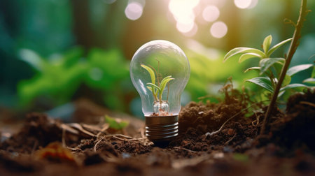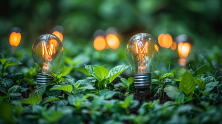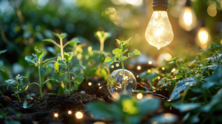 A glowing light bulb nestled among vibrant green plants serves as a powerful symbol of innovation and sustainability