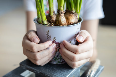 A child holds a bucket with prophetic tubers of flowers in his hands - spring concept