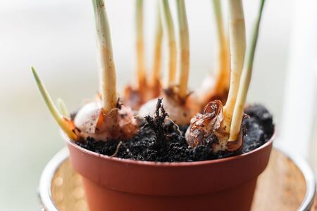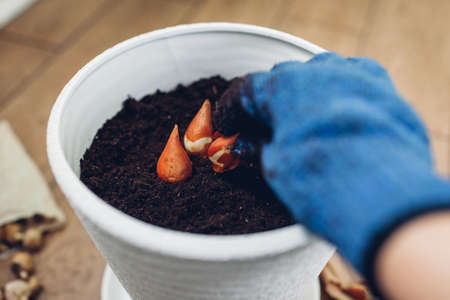 Gardener planting bulbs in pot at home. Tulip bulbs growing in container. Gardening work. Hobby