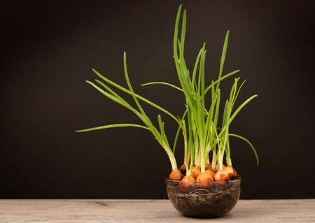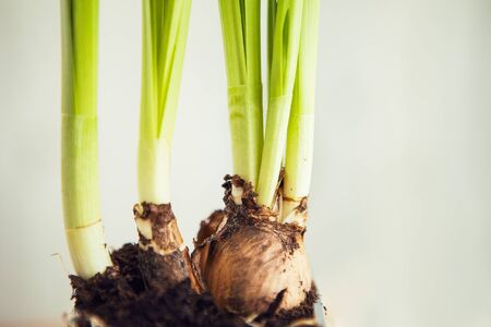 Sprouting onion bulbs on fertile soil as a concept of new life