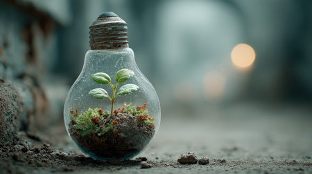 Plant growing inside lightbulb symbolizes innovation and sustainability, showcasing harmony between nature and technology. scene evokes sense of hope and creativity