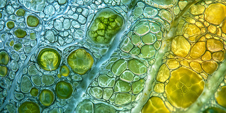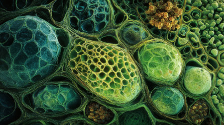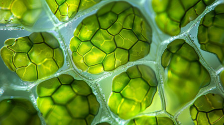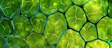 A microscopic view of green plant cells with visible chloroplasts and cell walls, illustrating the intricate beauty of plant biology.