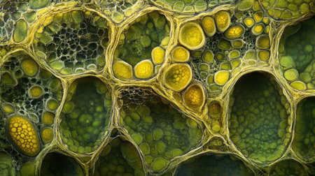 Fantasy plant cells microscopy. Green organic structures. Microlife concept. Generative AI.