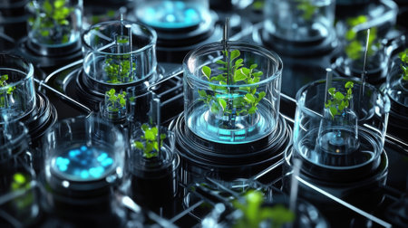 Green seedlings growing in test tubes. Biotechnology and biotechnology concept