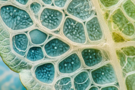 Detailed microscopic image of plant cells with turquoise hues, illustrating cellular structures and organization, emphasizing biological processes and scientific exploration