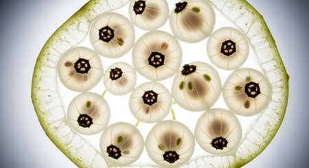 Microscopic view of actinoptychus heliopelta diatoms displaying intricate radial patterns and delicate internal structures, creating a mesmerizing display of nature's complexity at a cellular level