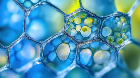 A close-up of plant cells under a microscope, showing intricate details and textures.