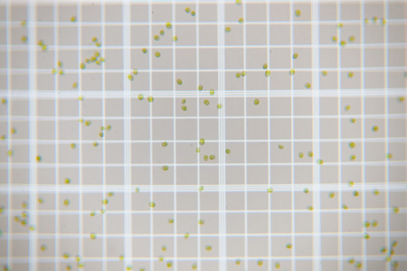 Fresh green plankton cells on scale counting chamber