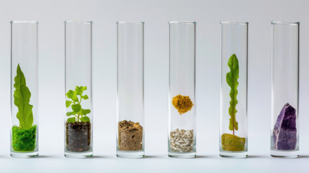 This image features six test tubes arranged in a row, each showcasing a unique natural element such as plants, soil samples, and minerals, representing various aspects of nature and science.