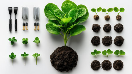 A plant is surrounded by various gardening tools and seedlings. Concept of growth and nurturing, as the tools and seedlings are meant to help the plant thrive