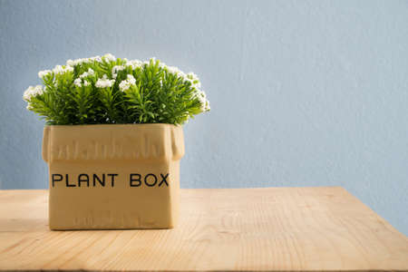 Empty white wooden table with green plant pot and white concrete wall texture background. Copy space, display montage for product