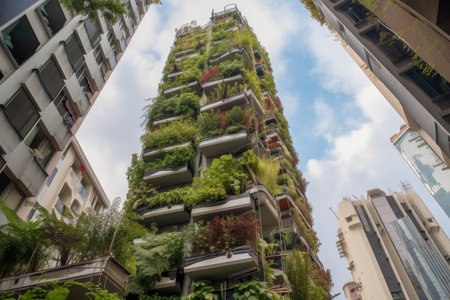 Eco-friendly living: the facade of a modern urban apartment building is decorated with lush green plants and trees