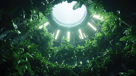 A vibrant indoor garden showcasing abundant green plants growing under a circular skylight and illuminated by modern artificial lights, creating a futuristic and sustainable environment.