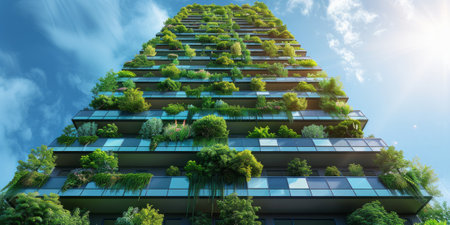 Modern eco-friendly skyscraper featuring lush green vegetation on balconies, highlighting sustainable and innovative architecture. Promotes urban greenery and environmental consciousness.