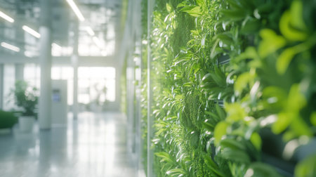 A modern interior design concept of sustainable urban living featuring an eco-friendly green wall with a variety of lush plants, creating a vibrant and refreshing atmosphere.