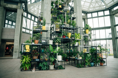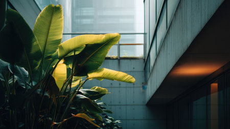 Lush plants growing in the atrium of a modern office building, creating a calming and productive work environment