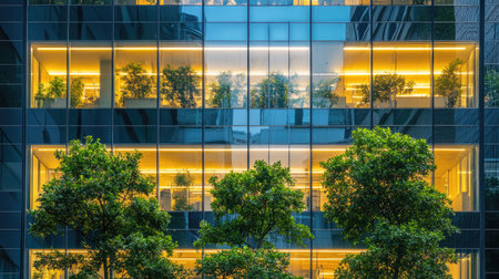 A striking modern office building featuring extensive greenery and glass elements. This eco-friendly design showcases sustainable architecture in an urban setting.