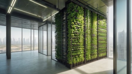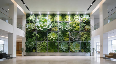 Sleek biophilic design illustration conveying serene eco-conscious mood through precise modular structuring and vivid luminous effects. Ideal for architects, interior designers, and sustainability consultants in portfolios, client pitches, website galleries, or trade show displays. Versatile composition supports scalable applications in hospitality, corporate, and re... AI-generated illustration.