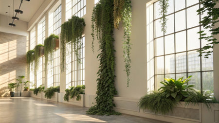 Sunlight pours through expansive windows illuminating the array of hanging plants cascading down the vertical structure where various shades of green contrast beautifully against.