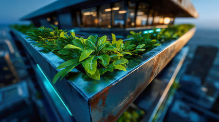 Innovative skyscraper office design featuring lush rooftop greenery and vibrant tropical plants