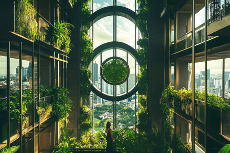 Lush plants adorn the interior of a modern urban building. A person stands looking out at the city skyline, framed by circular windows, illuminated by evening light.