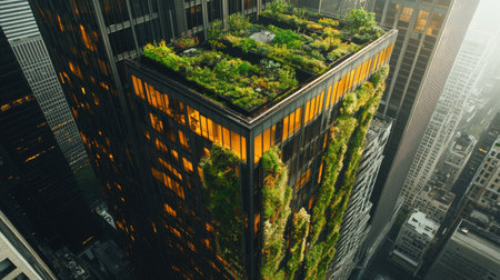 The buildings facade is adorned with plants and trees, creating a lush landscape visible from above. AIG41