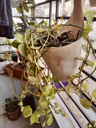 Hanging vine plant with heart-shaped variegated leaves of devil's ivy or golden pothos (Epipremnum aureum) the popular tropic houseplant for being indoor nature’s air purifier.