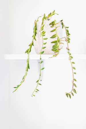 Senecio succulent plant in white pot indoor on shelf surrounded by white walls in minimalist composition, concept of indoor gardening and house plants
