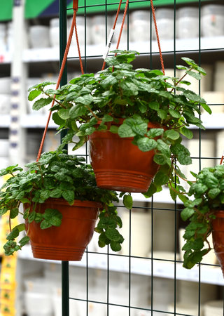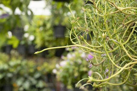 Many different plants in flower pots in flowers store. Garden center and wholesale supplier concept. green background. Lots of leaves.