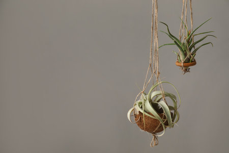 Tillandsia plants hanging on gray background, space for text. house decor
