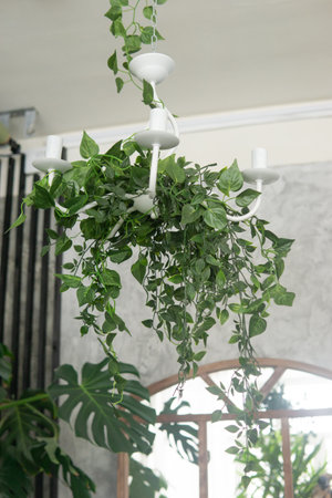 Hanging decorate green ivy plants in the garden, closeup with blurred background