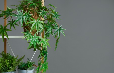 Decorative stand with house plants on grey wall background, copy space. Home greenery concept