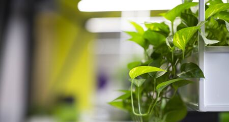 Potted green plants over blurred background with copy space, minimalistic scandinavian office interior.