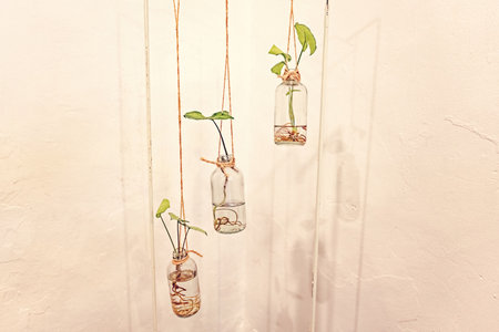 Small plants hanging in glass bottles interior decoration