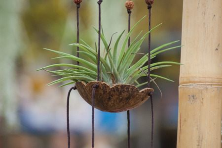 Green tillandsia air plants hanging in a pot