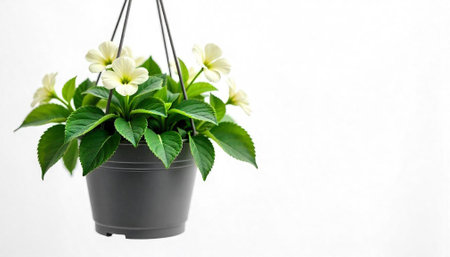Hanging Potted Plant with Cream Flowers against White Backdrop