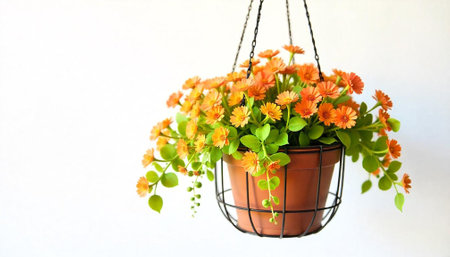 Hanging orange daisy flower basket on light background indoors