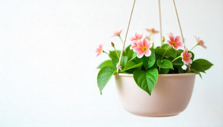 A charming potted plant hangs gracefully, showcasing vibrant greenery against a soft light backdrop. Ideal for conveying serenity and natural beauty.